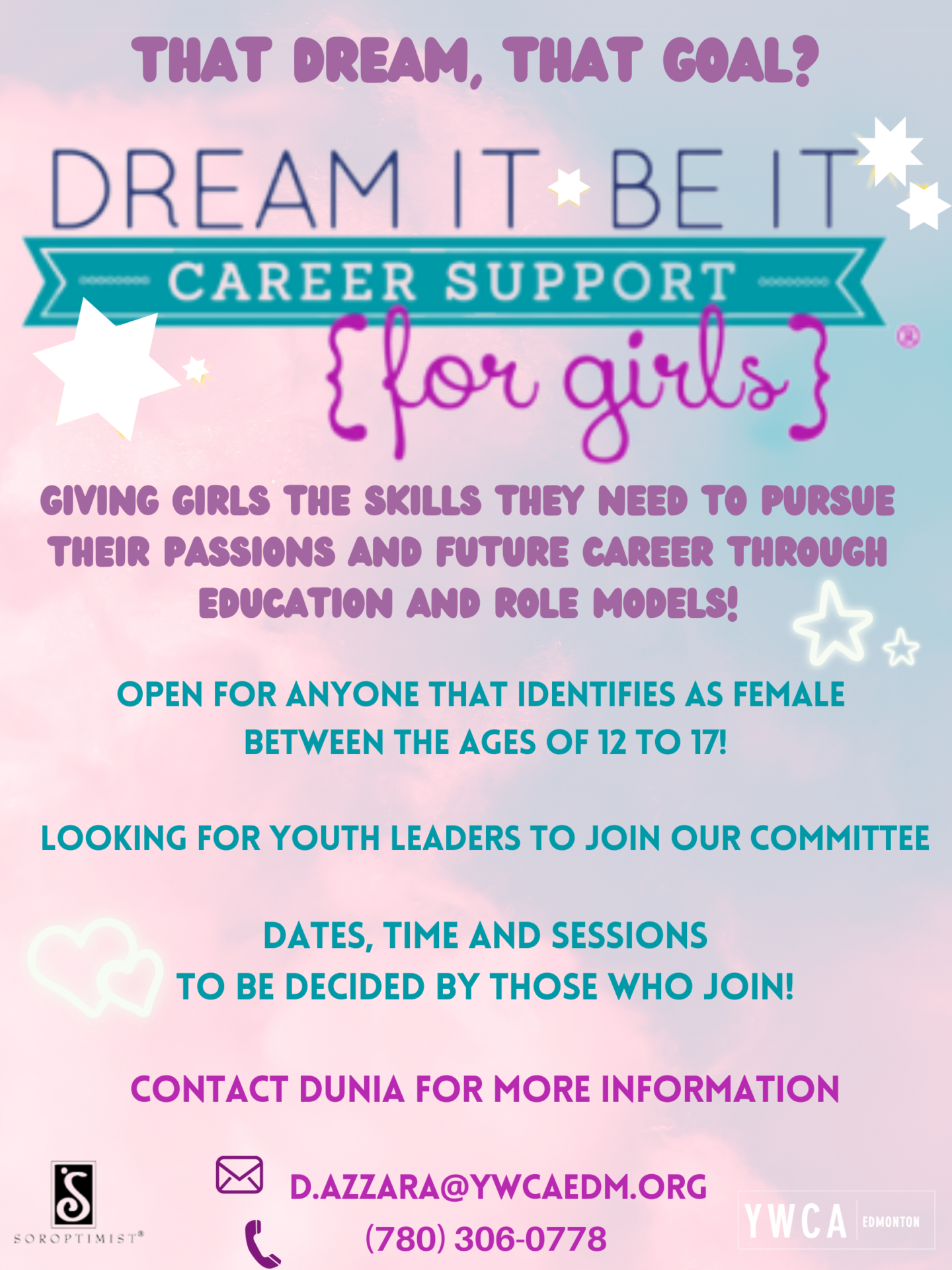 Dream It, Be It is a career-building program that aims to provide anyone who identifies as female (aged 12 to 17) with skills and values through direct and interactive work that will set them up for success in their future careers, whatever they may be. Dream It, Be It explores different career paths, connects girls to resources, mentors, and assistance to help girls find long-term success in their futures. Throughout seven sessions, participants will explore a variety of essential tools and factors for their future aspirations: